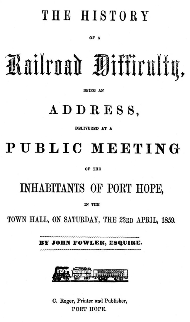 The public lecture-room in the Town Hall at Port Hope, was filled to its utmost capacity on Saturday, the 23rd April last, to listen to an address from Mr. John Fowler, the lessee of a portion of the Port Hope and Lindsay Railroad, and the Proprietor of a portion of the Branch to Peterboro', in which it was his purpose to recapitulate all the difficulties, past and present, of the road, his own exertions in connection with the construction of the Branch, and to point out the tyrannical, tricky, and otherwise unjustifiable course of conduct, pursued towards him and the stockholders of the Railway generally, by those Directors of the P. H. L. &, B. R. R. Co. who held, if they do not now hold, a controlling influence over its affairs, and are attempting to sacrifice the interests of those, who are responsible for the money incurred to make the road, to provide and maintain the rolling stock, and for keeping the road in working order. There were fully six hundred persons present when Mr. Fowler rose and said:—