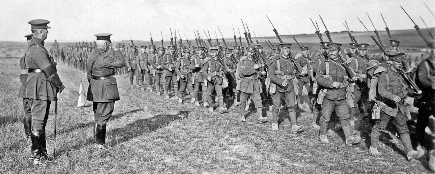 | The 1st Canadian Infantry Brigade marches past Minister of Militia and Defence Sam Hughes and Major-General Arthur Currie in the summer of 1916. |