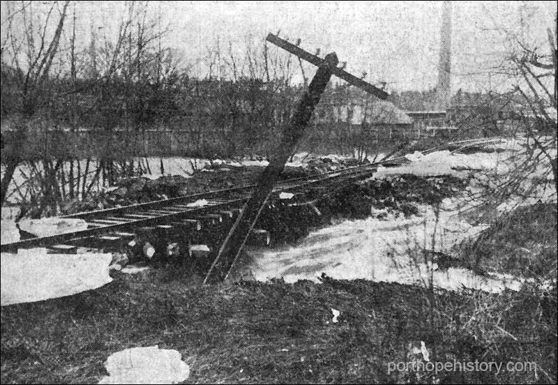 Driftwood, logs, ice, etc piled up against the Ontario Street bridge and huge cakes of ice were lodged on the Midland Railway tracks. Railway traffic on the Midland Division was completely demobilized and it will be some time before the right of way is cleared.