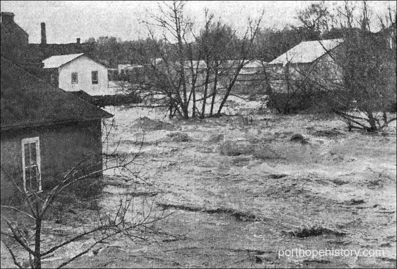 The Ganaraska, fed by its many northern tributaries, did not seriously threaten until about four o'clock this morning. Between five and six o'clock, it was apparent that a severe inundation was on its way. One assisting angle in connection with the trouble was the lack of ice, whereas last year tons of ice swept through the streets causing heavy damage.